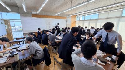 副校長の出身ゼミである東京大学片平ゼミから11人の東大生がやってきて彼らが考案した「職業選択ゲーム」というオリジナルなゲームを通じて自分の将来を考えるプログラムを行いました。