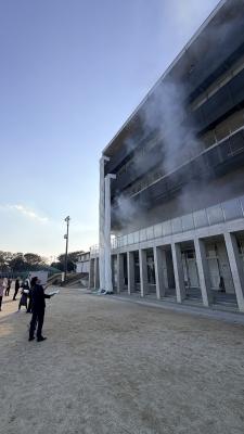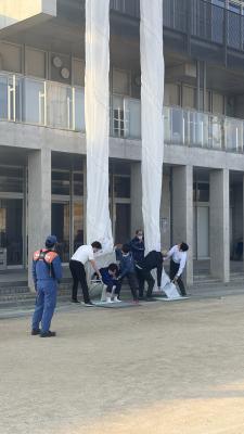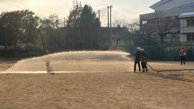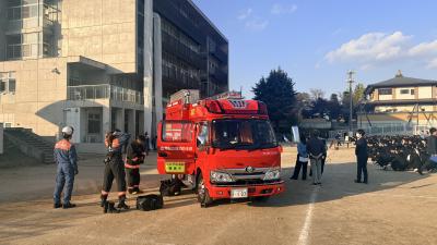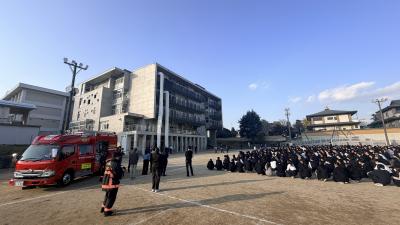 常総消防職員協力のもと、避難訓練を実施しました。給湯室から火災が発生した想定で、生徒たちはスムーズに避難を行い、救助袋による避難や放水による模擬消火訓練も行いました。